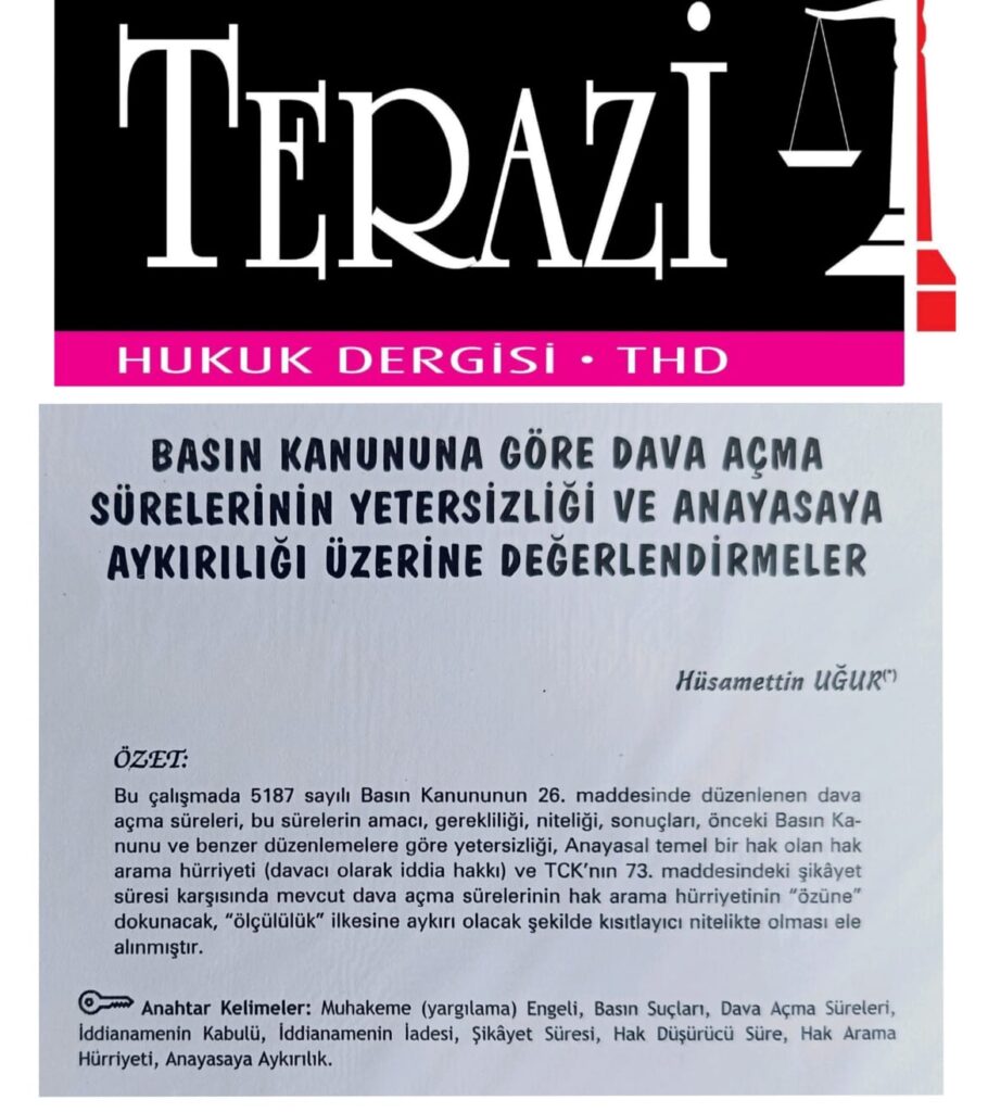 ÖZET: Bu çalışmada 5187 sayılı Basın Kanununun 26. maddesinde düzenlenen dava açma süreleri, bu sürelerin amacı, gerekliliği, niteliği, sonuçları, önceki Basın Kanunu ve benzer düzenlemelere göre yetersizliği, Anayasal temel bir hak olan hak arama hürriyeti (davacı olarak iddia hakkı) ve TCK’nun 73. maddesindeki şikayet süresi karşısında mevcut dava açma sürelerinin hak arama hürriyetinin “özüne” dokunacak, “ölçülülük” ilkesine aykırı olacak şekilde kısıtlayıcı nitelikte olması ele alınmıştır.