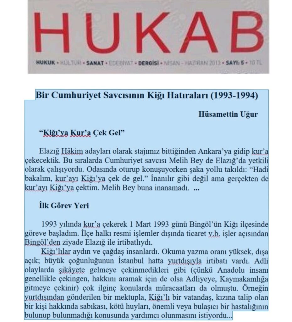 Elazığ Hâkim adayları olarak stajımız bittiğinden Ankara’ya gidip kur’a çekecektik. Bu sıralarda Cumhuriyet savcısı Melih Bey de Elazığ’da yetkili olarak çalışıyordu. Odasında oturup konuşuyorken şaka yollu takıldı: “Hadi bakalım, kur’ayı Kiğı’ya çek de gel.” İnanılır gibi değil ama gerçekten de kur’ayı Kiğı’ya çektim. Melih Bey buna inanamadı. Kendisi, bölgenin güvenli olmaması nedeniyle eşi ve çocuğunu yanında getirmemiş, terör ortamının stresi ile bazı sorunlar yaşamış, aldığı raporu ibraz ederek Manisa veya çevresinde bir yere tayin istemiş ancak Kurul (HSYK), kendisini geçici yetki ile Elazığ’da görevlendirmişti… Bütün bunları Kiğı’ya gidince öğrenecektim. Melih Bey yetkisi bitince asıl görev yeri olan Kiğı’ya döndü. İçinde bulunduğu şartlar sonucu aldığı raporla mesleğini tehlikeye atmış ve soruşturma geçirmişti.